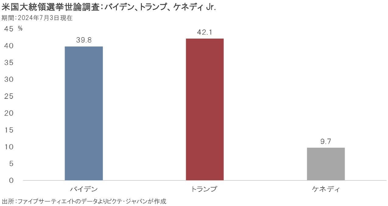 大統領選挙に関する世論調査の集計では、7月3日現在、バイデン大統領への支持が39.8%、トランプ前大統領は42.1%、無所属のロバート・ケネディJr.氏が9.7%だった。二大政党の現職、前職が共に勝利への決め手を欠くなかで、ケネディJr.など無所属候補の得票が、今回の大統領選挙において勝敗を左右する可能性は否定できない。これは、1992年、2000年の大統領選挙と同様の状況だ。