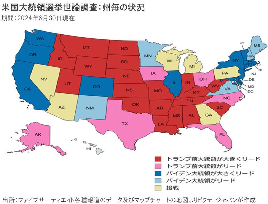 全米50州及びワシントンD.C.を選挙区とする米国大統領選挙では、各州ごとに連邦上下院議員数に従って割り当てられた選挙人を奪い合う仕組みだ。勝敗を決するのは、伝統的な民主党の支持基盤である『ブルーステート』、共和党色が強い『レッドステート』ではなく、選挙の度毎に勝敗が異なる『スウィングステート』だ。アリゾナ、ジョージア、ミシガン、ネバダ、ペンシルバニア、ウィスコンシンの6州がそれに相当すると見られる。