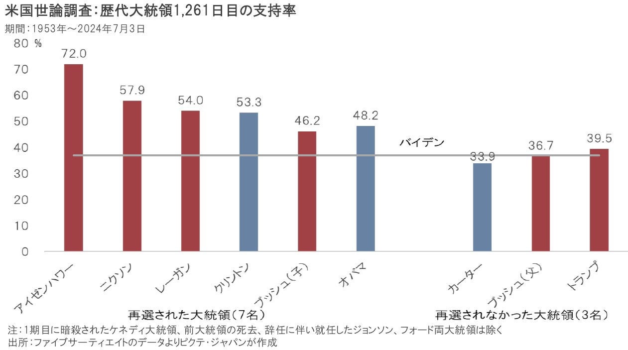 7月3日でバイデン大統領は就任から1,261日となったが、同じ条件で比較できる戦後の9名の大統領の同時期と比べた場合、再選された6名は何れも支持率が45%以上を維持していた。一方、再選に失敗したジミー・カーター、ジョージ・H・W・ブッシュ、ドナルド・トランプの3大統領の場合、この時期の平均は36.7%だ。足下のバイデン大統領の支持率は37.1%なので、この3名と概ね同水準と言えるだろう。