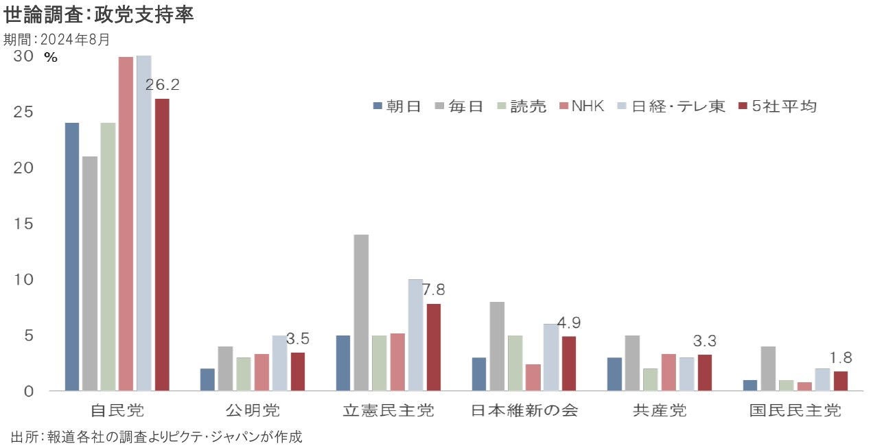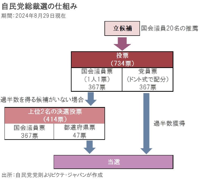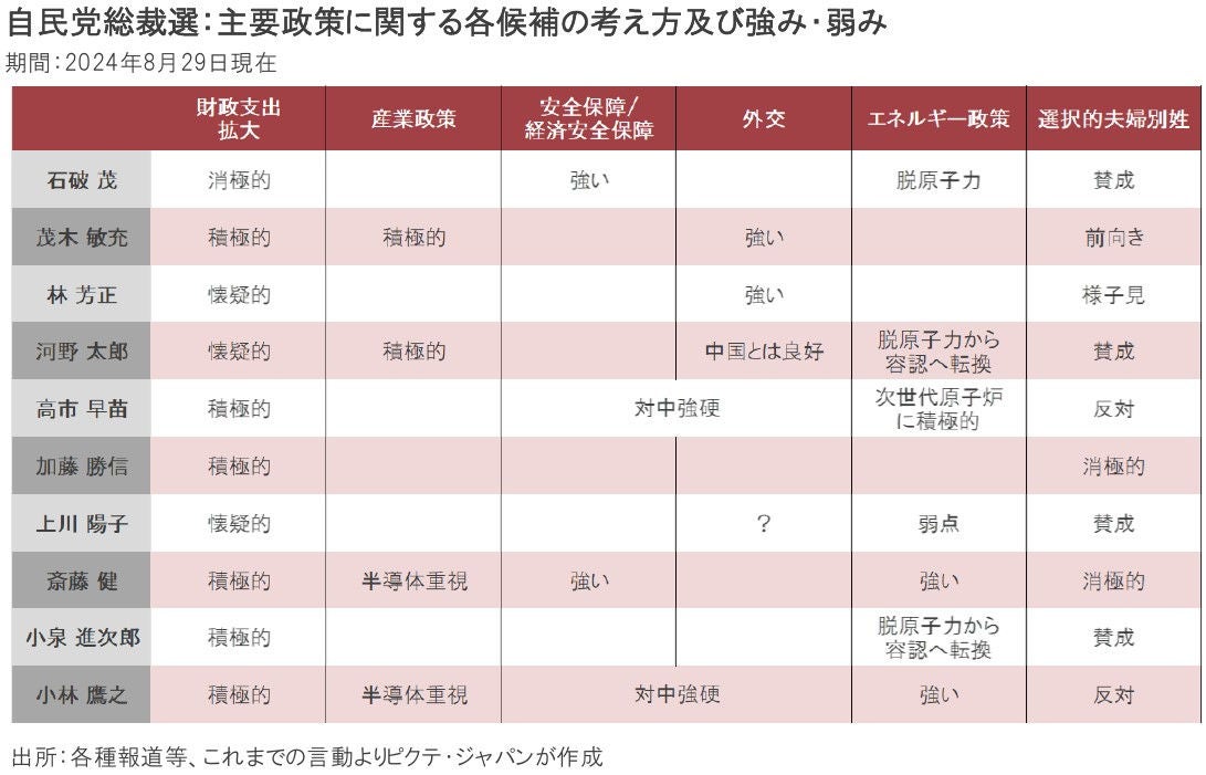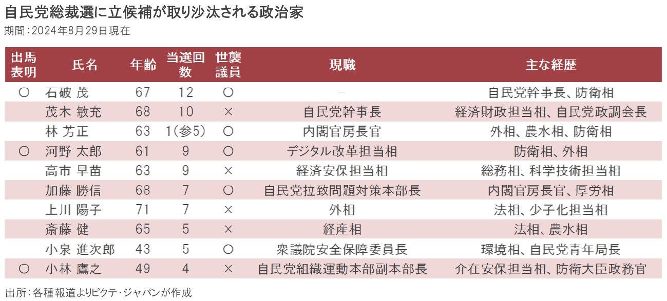 今回の自民党総裁選は、概ね1年以内に行われる衆議院の総選挙、2025年7月の参議院選挙を戦うため、自民党の顔を選ぶイベントと言える。特に1回目の投票では国会議員票は分散が想定され、一般党員票が重要な鍵を握るだろう。世論調査の結果を参考にする限り、石破氏、小泉氏、高市氏、河野氏などを軸に選挙戦が展開されるだろう。新首相(新自民党総裁)の下、10月中旬に衆議院が解散され、11月10日を軸に総選挙が行われると見られる。今秋は日米両国が選挙の時期となりそうだ。