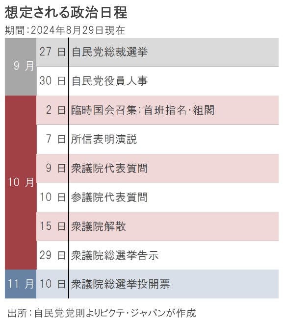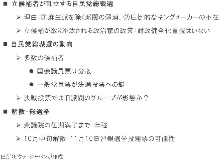 自民党総裁選が終わり、新たな首相の下で新内閣が発足すれば、衆議院の任期は3年に接近する。過去の経験則から、新首相は10月中旬にも衆議院を解散、11月10日を目途に総選挙を行う可能性が強い。それは、新内閣に対する国民の信を問うことで、早期に政権基盤を強化できることが理由だ。加えて、解散期を失した場合、衆議院議員の任期満了まで間がなく、選択肢が狭まりかねないからだ。