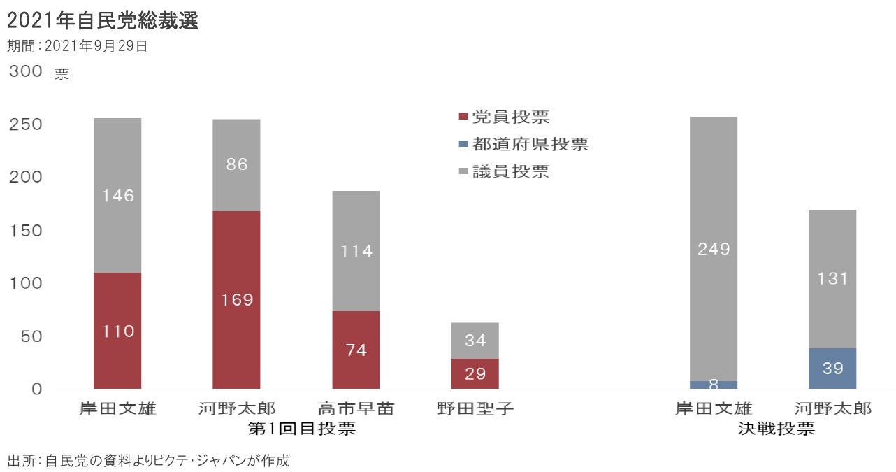 2021年9月の自民党総裁選では、岸田文雄現首相を本命としていた安倍晋三元首相が、党員票に強い河野氏との一騎打ちを避ける上で、高市氏、野田聖子元総務相の立候補を支援した。その上で、岸田、河野両氏による決選投票では、安倍派、麻生派、岸田派などの国会議員をまとめ、岸田首相を勝利に導いたと考えられる。今回、そうしたキングメーカーはおらず、選挙の帰趨は極めて読み難くなった。