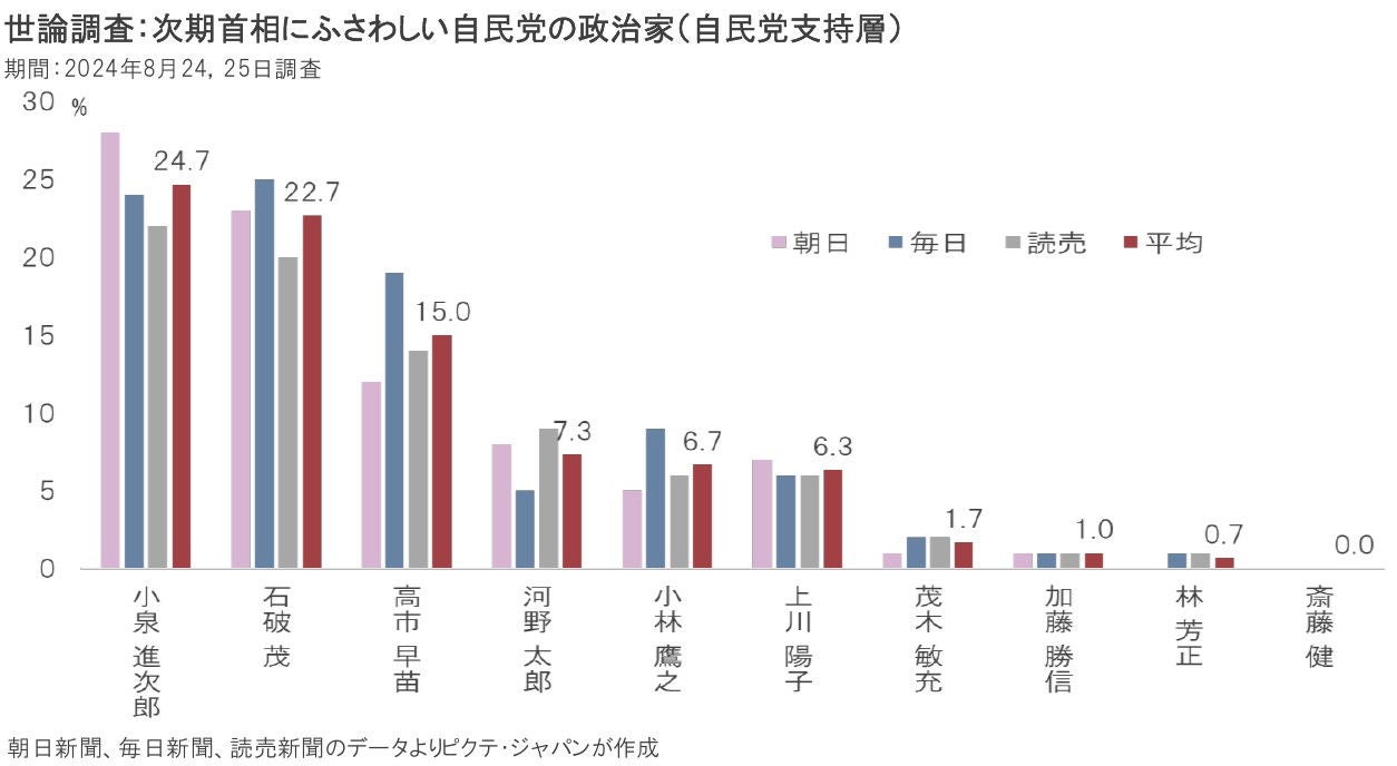 8月24、25日に朝日、毎日、読売各紙が実施した世論調査によると、自民党支持者の間では、小泉氏、石破氏、高市氏、河野氏の支持が先行している。ただし、これは投票権を持つ自民党員を対象とした調査ではない点に注意が必要だ。一方、茂木幹事長、林官房長官など、政府・自民党の幹部は人気がない。それでも、立候補せざるを得ないのは、世代交代の可能性が高まるなか、存在感を示す必要があるからだろう。