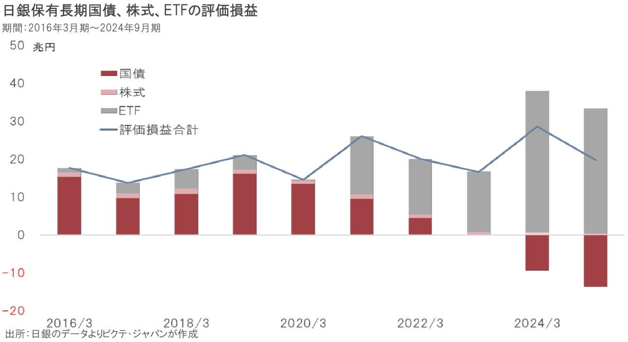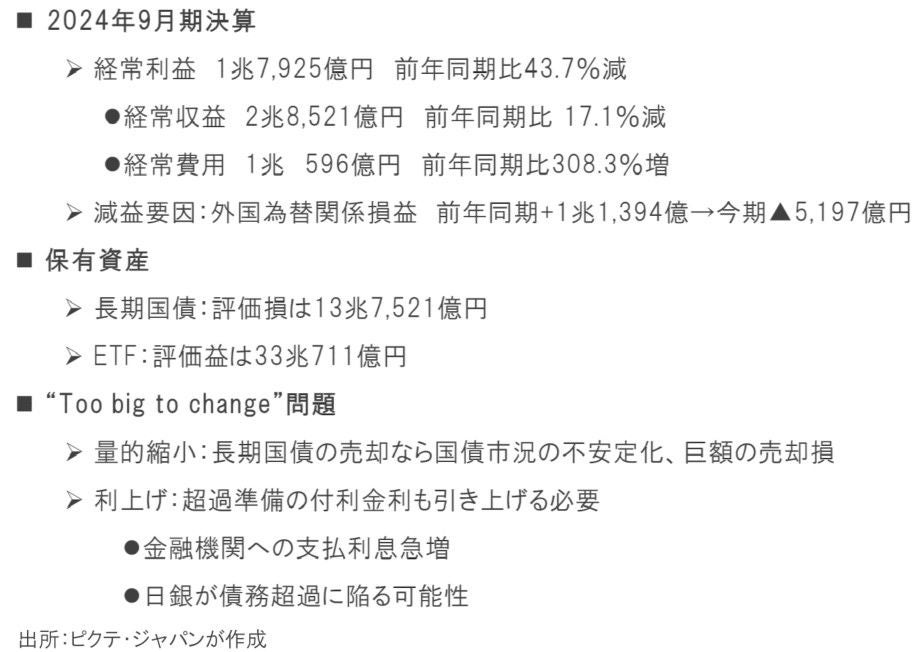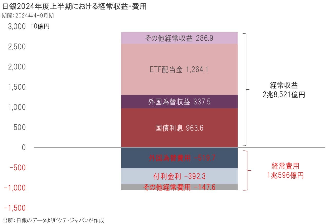 2024年度上半期は、為替の円安が一服したことで、前年同期に経常利益を1兆1,394億円押し上げていた外国為替関係損益が、今9月期は5,197億円の損失となった。つまり、為替は1兆6,591億円の減益要因である。一方、ETFの受取配当が1兆2,641億円に達し、経常収益全体の44.3%を占めた。保有する国債の利息収入9,636億円と合わせ、日銀の経常収益の大きな柱と言えるだろう。