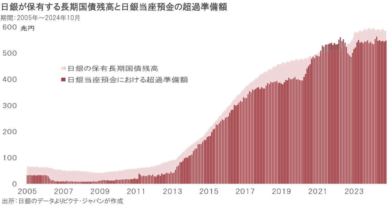 2013年4月4日、黒田東彦日銀総裁(当時)の下で採用された量的・質的緩和の最重要ポイントは、日銀が長期国債を市場から大量に購入し、その対価としてマネタリーベースを供給することだった。日銀の保有する長期国債の残高に沿う形で、日銀当座預金に超過準備が膨らんだのは、供給されたマネタリーベースが、貸出を刺激することなく、そのまま市中銀行を通じて日銀の当座預金に積み上げられた結果と考えられる。