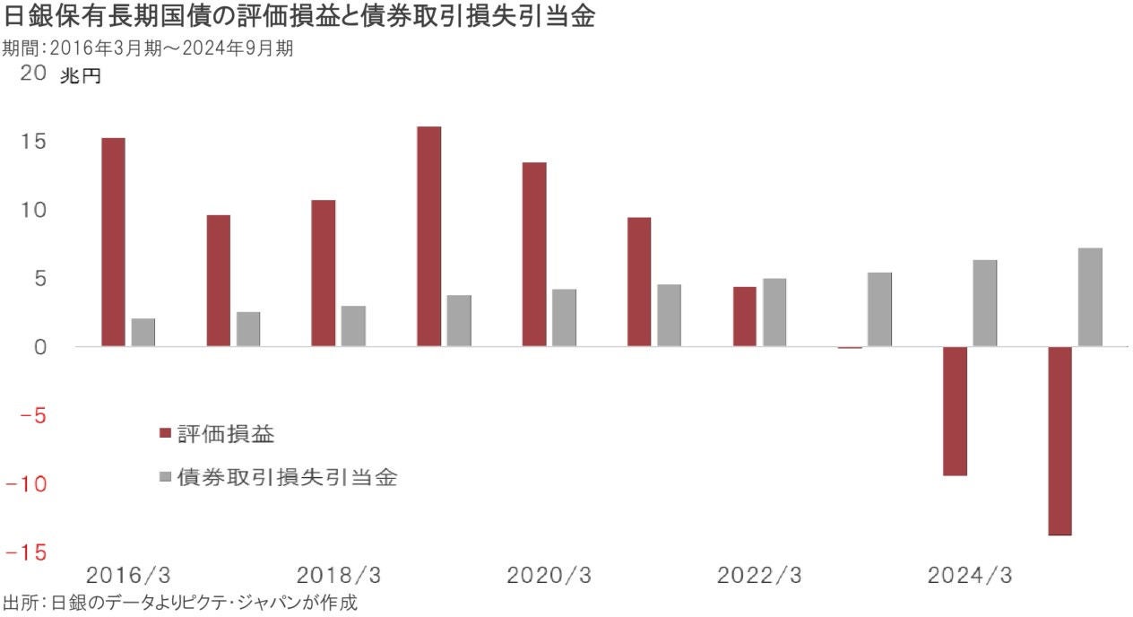 日銀は保有する長期国債に関して、満期までの保有を前提に償却原価方式で評価している。従って、アモチゼーションによる均等処理分を毎期計上する必要はあるものの、この評価損が日銀の収益、経営に大きな影響を与えることはない。ただし、売却すれば損失が実現する。これは、日銀が出口戦略の一環で量的縮小を図る際、バランスシートを圧縮する上での大きな制約要因と言えるだろう。