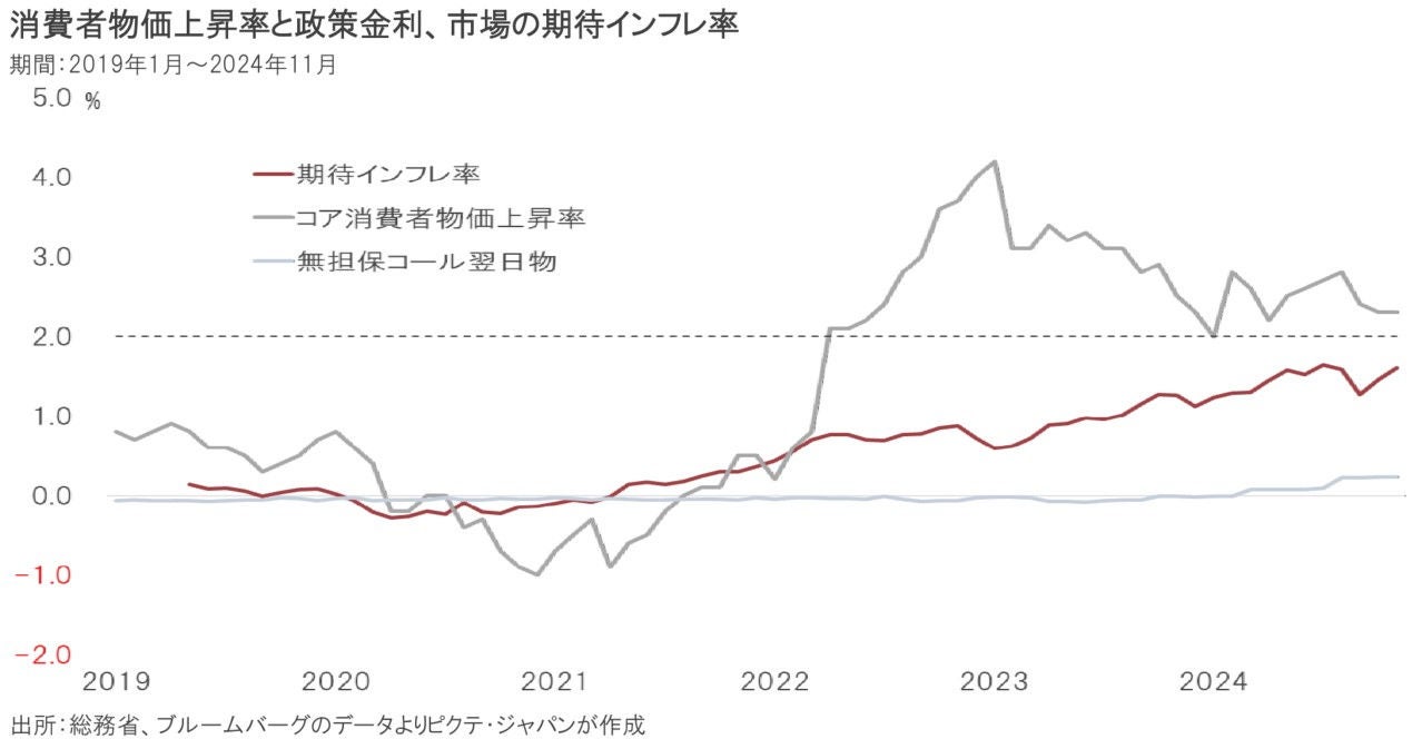 インフレ連動国債と10年国債の利回りから算出した市場が織り込む期待(予想)インフレ率は、足下、1.6%になっている。日銀がターゲッティングしているコア消費者物価上昇率は2%であり、まだその水準には達していない。ただし、円安による輸入物価の上昇やコメ価格の値上がりなど、基調的でない要因によるインフレ圧力は根強い。期待インフレ率の上昇もトレンドとして続くことが想定される。