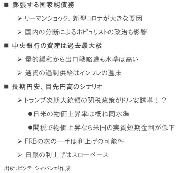 ポピュリズム的政治の下、世界は構造的なインフレの時代に突入した可能性がさらに高まった。相対的な通貨価値の下落は続くと考えられる。特に日本の場合、通貨安の脱却は容易ではないと想定されるが、今のところ政治の世界で財政政策・金融政策がもたらすリスクに深刻な懸念が広がっているわけではないようだ。トランプ政権の政策次第で一時的にドル安・円高になる可能性はあるものの、基調が円安である状態に変化はないだろう。家計・個人は、構造的なインフレへの備えが重要なのではないか。