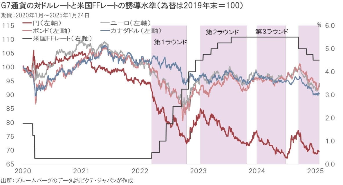 対ドルで円安が顕著に進んだのは、2022年3月以降だ。円のみならず、ユーロ、英国ポンド、そしてカナダドルなど他の主要通貨もドルに対して大幅に下落した。起点になったのは、FRBが同月15、16日に開催されたFOMCで利上げに踏み切ったことではないか。もっとも、他の主要通貨が2022年の秋以降は安定したのに対し、円相場は3回のリバウンドを経つつも基調として下落が続いている。