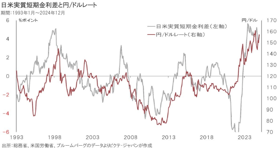 新型コロナ禍から経済が正常化する過程において、日本もデフレを脱却し、むしろインフレが懸念される状況になった。その結果、日米両国の消費者物価上昇率は概ね同水準になっている。つまり、足下は名目金利差と実質金利差がほぼ等しくなった。名目短期金利の水準は中央銀行の政策に大きく依存するため、日銀とFRBの政策金利を巡る判断が、為替の重要な決定要因になったと言えよう。