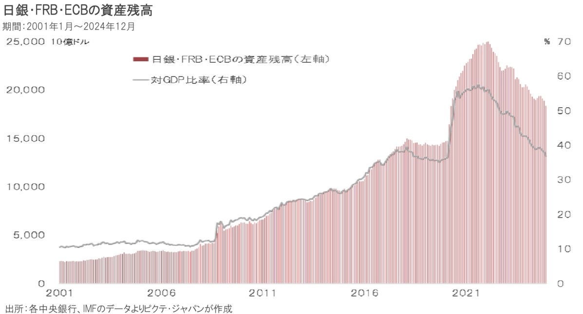世界が新たなインフレの時代に突入した背景は、国際社会、国内社会の分断だろう。分断はヒト・モノ・カネの自由な移動を妨げ、経済の最適化が阻害される結果、コストが上がって物価を上昇させる効果を生む。また、所得格差を背景に国内で進む分断は、政治的にはポピュリズムの台頭を招いてきた。それは、財政収支を健全に維持するよりは、バラマキ的な歳出の要因だ。G7の場合、国家純債務の対名目GDP比率は21世紀に入って急上昇している。この国家純債務と表裏の関係で、日銀、FRB、ECBの資産残高対GDP比率も膨張した。実体経済に対してマネーの過剰供給が恒常化することで、インフレと資産価値の拡大が続く可能性が強い。特に11年間に亘って量的緩和を継続した日銀のバランスシートは、他の中央銀行に比べ極めて大きくなった。一方、米国経済が堅調であり、トランプ政権の政策次第でFRBは2025年末から2026年前半にも利上げを検討する可能性がある。日銀が積極的な出口戦略を採らない限り、構造的な円安が続くのではないか。