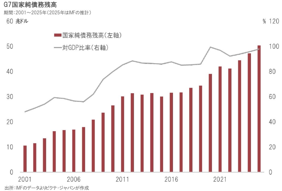 G7全体の国家純債務の対名目GDP比率は、21世紀がスタートした2001年に48.1%だった。IMFによれば、2025年にこの比率は97.8%に達すると見られる。リーマンショックや新型コロナ禍への対応もあり、名目GDPの年平均成長率が3.4%だったのに対して、国家純債務が年6.7%のペースで拡大したからだ。ポピュリズムが政治の主流になりつつあることで、財政の健全性は優先順位が後退したと言えよう。