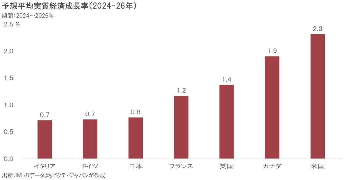 IMFによれば、2024~26年の3年間、日本の実質成長率は年0.8%で、ドイツ(同0.7%)、イタリア(同0.7%)とほぼ同水準だ。一方、米国は2.3%であり、政策金利の水準が最も高いにも関わらず、最も高い成長率が見込まれている。1)財政による純債務が大きく、2)供給された流動性が相対的に最も過剰で、3)実質成長率が低い・・・この3つの要因が、円の評価を形成している可能性は否定できない。