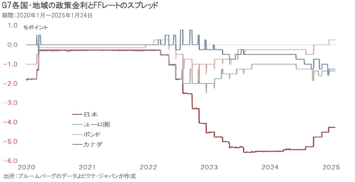 日銀は、1月23、24日の政策決定会合で0.25%ポイントの利上げを行い、無担保コール翌日物の誘導水準を0.50%とした。一方、FFレートは4.25~4.50%で据え置かれ、日米の名目政策金利差は3.75~4.00%ポイントになっている。これは、円キャリートレードには十分なスプレッドではないか。また、足下は名目金利差が実質金利差に近いため、ファンダメンタルズからもドル高・円安要因と言えよう。