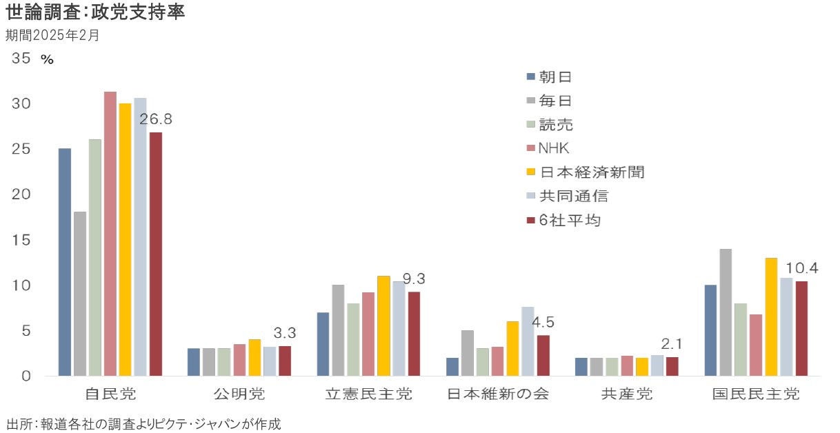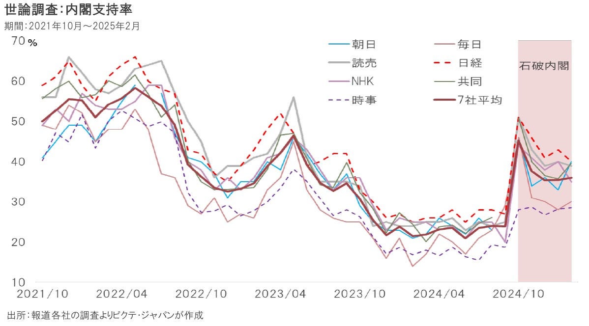 2月に大手メディア7社が行った世論調査の結果を見ると、石破内閣の支持率は平均で36.0%になった。前月と比べ0.6%ポイントの上昇だ。昨年12月の35.3%を底として、取り敢えず下げ止まっている。2月7日に行われた石破首相とドナルド・トランプ大統領による日米首脳会談が、有権者の安心感につながったのではないか。ただし、絶対水準が高いとは言えないだけに、緊張感の高い状況が続くだろう。