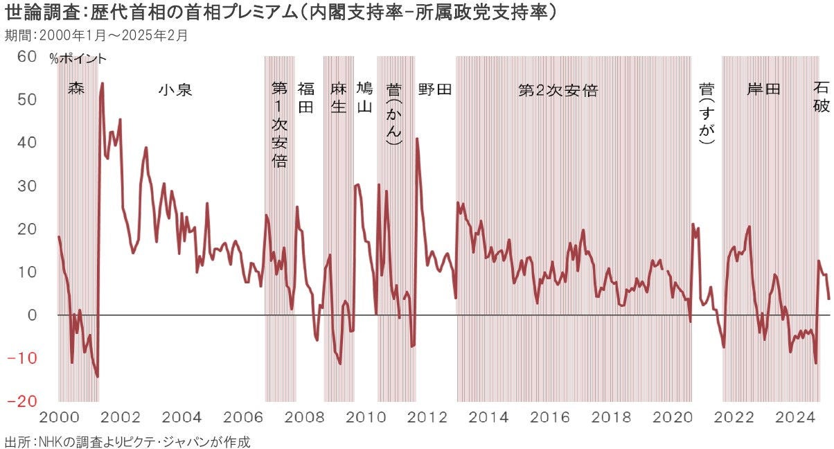 内閣支持率は、基本的に内閣総理大臣の支持率と言える。その内閣支持率から首相の所属政党の支持率を差し引いたのが「首相プレミアム」と呼ばれる指標だ。歴代の首相を見ると、首相プレミアムがマイナスになった場合、退任を避けられなかったケースが多い。石破首相の場合、首相プレミアムはプラスゾーンを維持している。ただし、マージンは僅かであり、政権が盤石な状況であるとは言えないだろう。