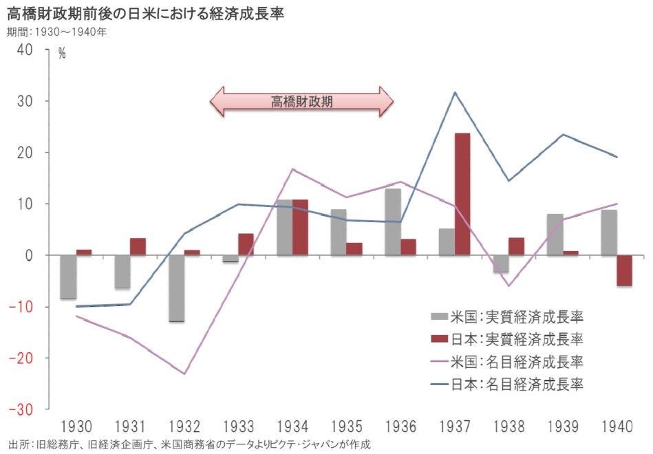 米国での株価急落を受け世界恐慌が始ったのは1929年秋だ。高橋財政の期間を1932~36年とすれば、日本は1933年頃にはデフレを脱却、「列強」と呼ばれた主要国において最速でデフレを克服した。経済学に多大な影響力を及ぼしたジョン・メイナード・ケインズが『雇用、利子及び貨幣の一般理論』を発表したのが1936年であり、高橋はそれより以前に財政による有効需要の創出を実践した政治家だ。