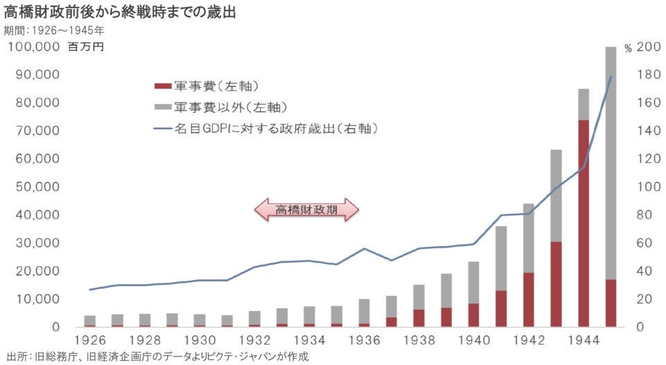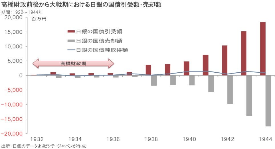 高橋財政に関する大きな誤解は、日銀による国債引受けに関するものだろう。高橋財政下、日銀は35億5千万円の国債を引き受けた。ただし、この5年間に31億9千万円を市中で売却している。つまり、当時の日銀は国債を一時的に保有はしたものの、残高を積み上げてはいない。むしろ、高橋は1935年7月の国民向け声明で、国債を日銀が背負い込めば、悪性インフレに陥りかねないと警告した。