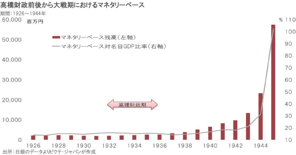 1932~36年の5年間、マネタリーベースの平均増加率は年7.0%に留まり、この間の名目成長率の7.3%を若干ながら下回った。高橋財政は財政による有効需要拡大策だが、マネタリズム的なデフレ脱却策ではない。量的金融政策として高橋が目指したのは、金本位制の離脱によりマネタリーベース供給上の制約を取り払い、その増加ベースを名目経済成長率と一致させることだったわけだ。