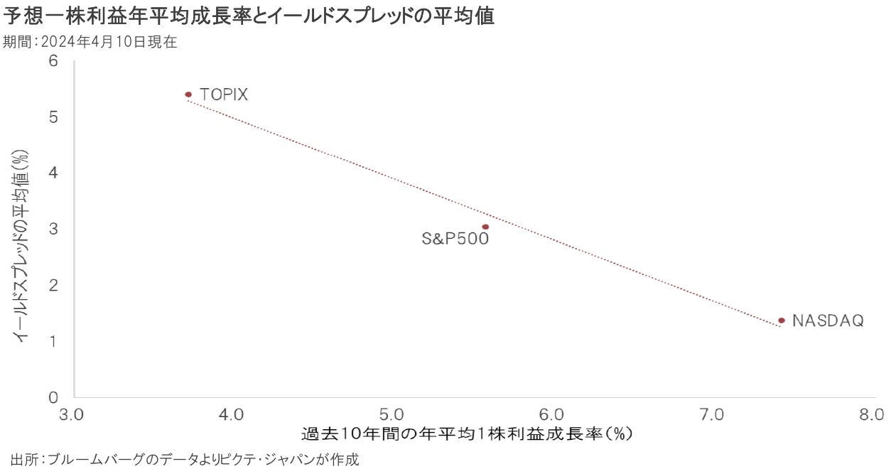 株式益回りは株価収益率(PER)の逆数であり、成長株は低くなる傾向(PERは高くなる傾向)がある。従って、利益成長とイールドスプレッドも逆相関の関係が成り立つと考えて矛盾はない。つまり、各指数のイールドスプレッドは、指数間の相違を評価するよりも、個々の指数のトレンドに対する位置を評価の対象にすべきだろう。その前提に立てば、米国の2指数よりも、TOPIXの調整がより進んだと考えられる。