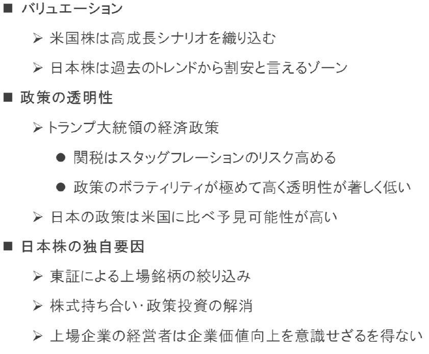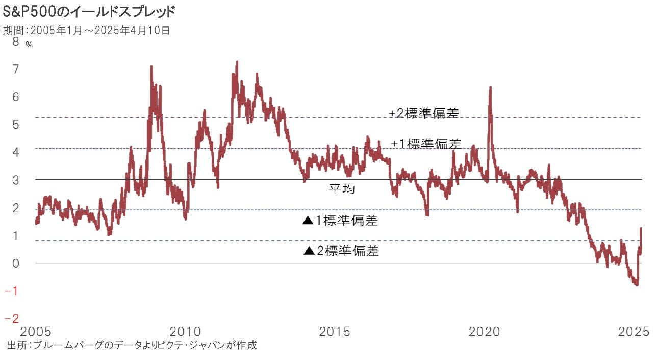 世界の主要株式市場で乱高下が続いている。朝令暮改を繰り返すドナルド・トランプ大統領の関税政策により、金融市場は先行きの不透明感を強く意識せざるを得ないからだろう。その関税の影響が経済面で顕在化するのはこれからであり、まだ株価が底を打ったと確信が持てる状況ではない。歴史が証明しているのは、底値を正確に当てることが不可能である以上、こうした極めて不透明な環境下こそ、長期的な観点から時間分散が機能することだ。仮に段階的に投資を進めるとすれば、ファンダメンタルズに照らして、今は米国株よりも日本株の優先順位が高いのではないか。理由は1)バリュエーション、2)トランプ関税の影響度合い、そして3)バリュー・・・の3点だ。バリュエーションの評価に関して、1株利益を株価で割った値である株式益回り(=株価収益率PERの逆数)から10年国債の利回りを引いたイールドスプレッドを見ると、米国市場に比べ、日本株に割安感がある。ただし、バラマキ的な財政政策により、日本の長期金利が上昇するリスクには注意が必要だ。