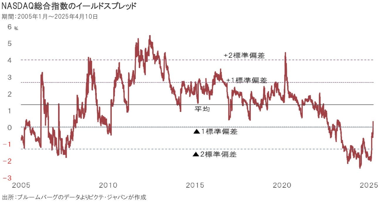 NASDAQ市場の場合、足下のイールドスプレッドは▲0.20%だ。平均は1.38%、標準偏差は1.31%ポイントだった。2023年8月から平均を2標準偏差程度下回っていたものの、10日の時点では2標準偏差の範囲内へは戻っている。ただし、統計的に標準的なゾーンである平均±1標準偏差のゾーンに止まることはできていない。「割高」とまでは言えないが、利益成長と金利の安定を前提とした水準だ。