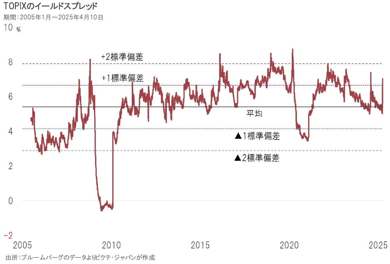 TOPIXのイールドスプレッドは、4月10日現在、5.99%になった。過去の平均は5.40%、標準偏差は1.25%ポイントだ。つまり、足下の株価は企業業績と金利の関係から平均的ゾーンに位置している。不透明要因は、米国の関税政策が日本企業の業績に与える影響だ。さらに、「物価対策」、「関税対策」として、バラマキ的な財政政策が実施された場合、長期金利が上昇して評価が変わる可能性がある。