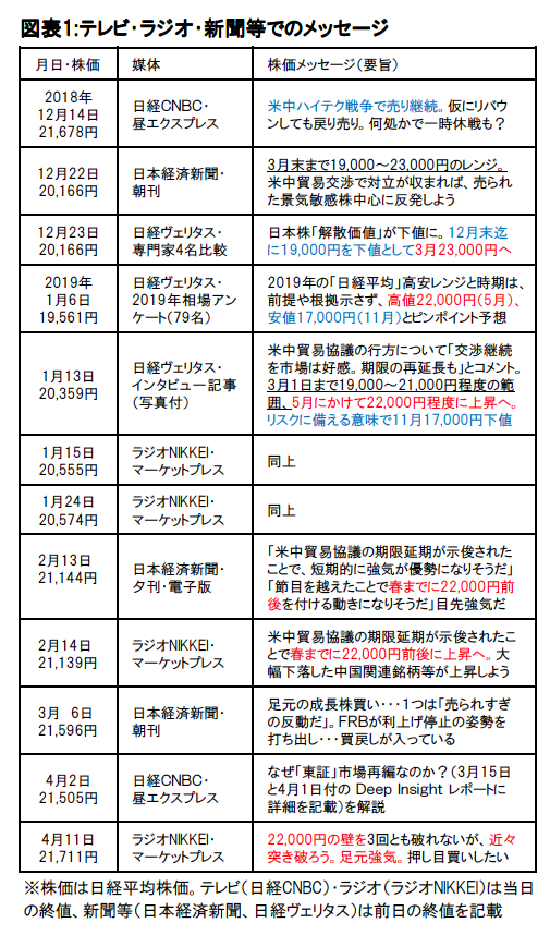 図表1は、私が2018年12月14日以降のテレビ(日経CNBC)・ラジオ(ラジオNIKKEI)・新聞等(日本経済新聞、日経ヴェリタス)で発信したメッセージの一覧です。この期間の日経平均株価は、ほぼ予想どおりの推移となっています。