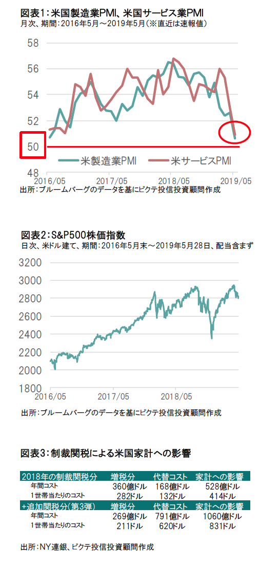 トランプ米大統領が制裁関税第3弾を発動し、さらに制裁関税第4弾の発動も示唆して以降、おそらく最も速報性の高い米国5月PMI(購買担当景気指数)が5月23日に発表されました。内容は大方の予想よりも悪い内容で、特に米国製造業PMIは116か月ぶりの低水準となりました。PMIは景気先行性の高い指標であるため、景気の下振れリスクが高まっていると言えます。