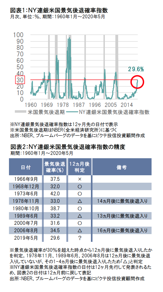 ニューヨーク(NY)連銀は12ヵ月後の米国景気後退確率を指数として毎月算出しています。このNY連銀米国景気後退確率指数(以下、景気後退確率)は、米国10年国債利回りと米国財務省証券3ヵ月物利回りとの長短金利差をもとに計算されています。図表1は、この景気後退確率と実際の米国景気後退期を比較したものです。ご覧の通り、足元の景気後退確率は、長短金利差の縮小/逆転を反映し29.6%まで大きく上昇しました。