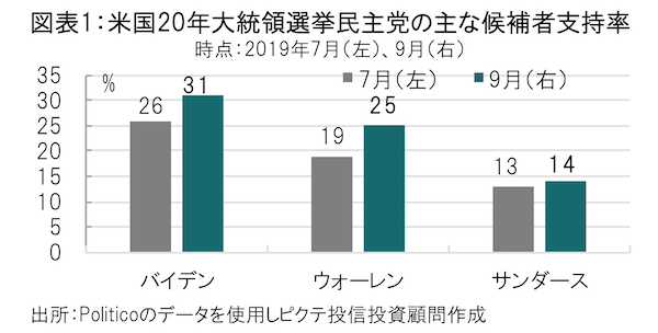 政治専門サイトのポリティコによると、討論会後に実施した世論調査で各候補の支持率を見ると、バイデン前副大統領が31%と依然リードしながら、左派の論客で知られるウォーレン氏が25%と差を縮めました(図表1参照)。