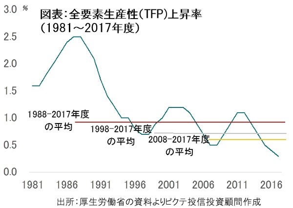 ちなみに、日本のTFPの伸びは長期的な縮小傾向にあり、第2次安倍政権発足以降、2017年度まで5年間の年平均増加率は0.6%だった(図表)。さらに、2017年度は0.3%まで落ち込んでいる。つまり、アベノミクスの下ですら、2004年度の年金制度改革で示された代替給付率50%維持は難しい目標になりつつあるわけだ。