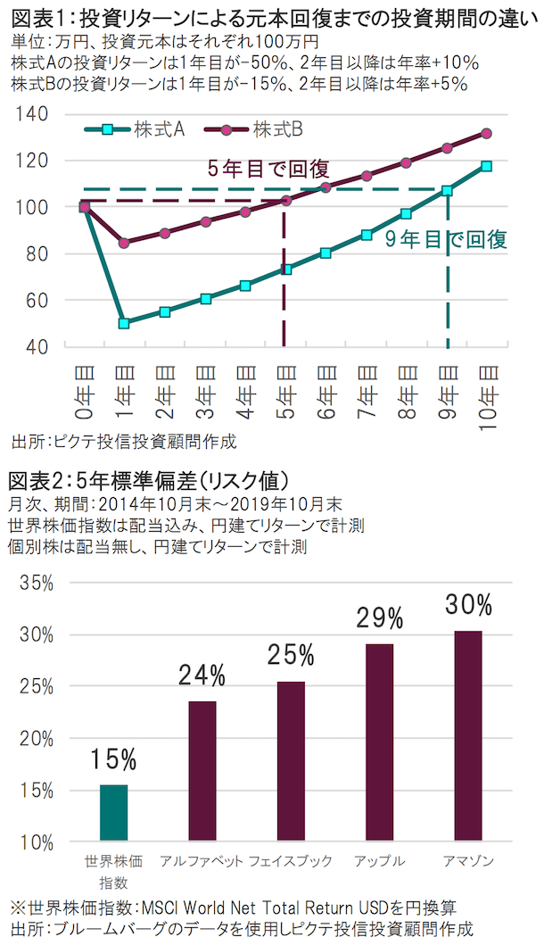そのバフェット氏の投資原則の中で有名なのが「【ルール1】 絶対に損をしないこと。【ルール2】 ルール1を絶対に忘れないこと」である。もちろん投資の世界で絶対に損をしないことなどあり得ないのだが(実際バフェット氏も過去に損失を出している)、筆者なりにバフェット氏の投資原則を解釈すると、前述した投資リターンの計算方法と重なる部分があると考える。つまり、過度なリスクを取って大幅な損失を出してしまうと、元本回復まで相当な時間と期待リターンが必要になるので、適切なリスク管理が重要になるということだ。