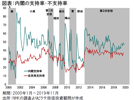 NHKが11月8〜10日に実施した世論調査によれば、安倍内閣の支持率は47%だった(図表)。10月11日の内閣改造で初入閣した菅原一秀前経産相、河井克之前法相が相次いで辞任を余儀なくされたものの、支持率は9月に比べ1%ポイントの低下に止まる。実質的な更迭と後任の人選、任命責任を認めた謝罪を迅速に行なった安倍首相の危機管理が機能しているようだ。