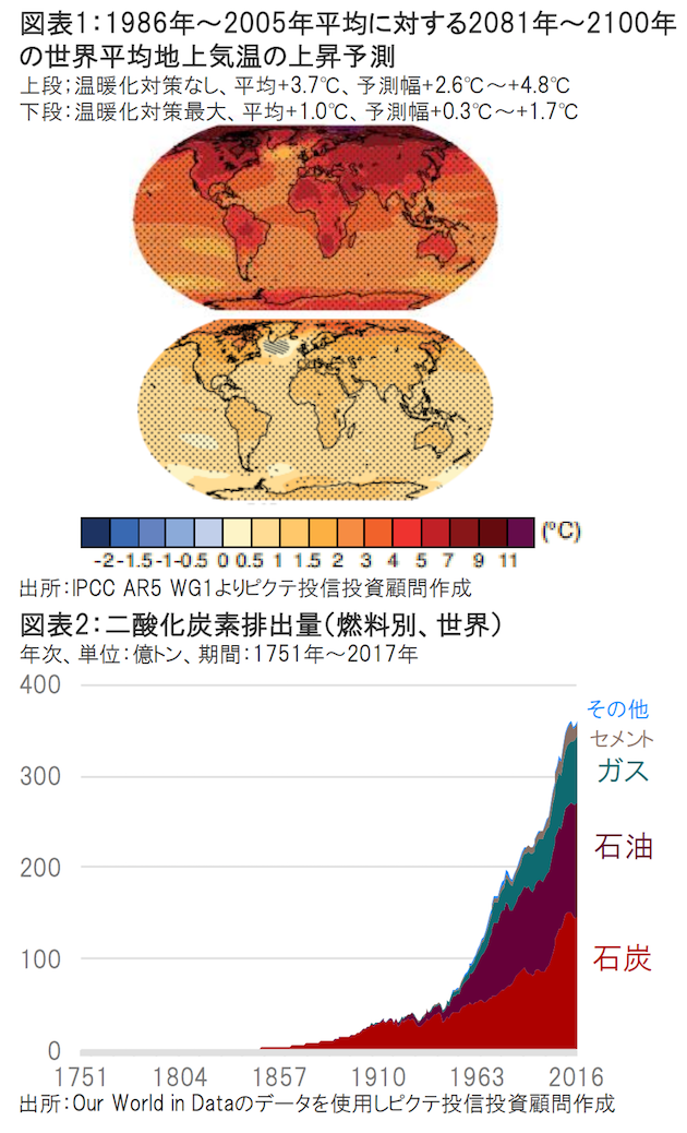 しかし、その間もGHGは着実に排出され続け、気候変動に伴う損害(含むGHG削減費用)は加速度的に増加することになる。巨大氷床の崩壊や海洋循環の大規模な変化、永久凍土に閉じ込められた強力なGHGであるメタンハイドレートの融解によって、温暖化が急激に進むことが予想されるためだ。国連環境計画(UNEP)と世界気象機関(WMO)によって設立されたIPCC(国連気候変動に関する政府間パネル)によれば、温暖化対策が最大の場合、2081年~2100年の世界平均気温上昇は1986年~2005年平均と比較して平均+1.0℃にとどまるが、温暖化対策なしでは平均+3.7℃となる(図表1)。