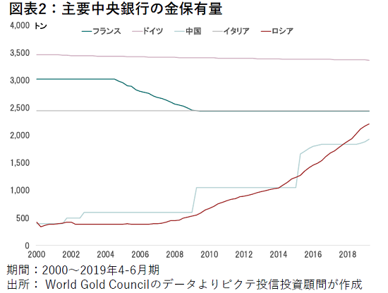 他の中央銀行に目を転じると、金準備を着実に増やしているのは中国とロシアだ(図表2)。まだ米国の4分の1程度だが、他国と明らかに異なる動きをしている。
