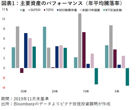 過去30年間の金価格を他の資産と比べると、安定して良好なパフォーマンスを示している(図表1)。