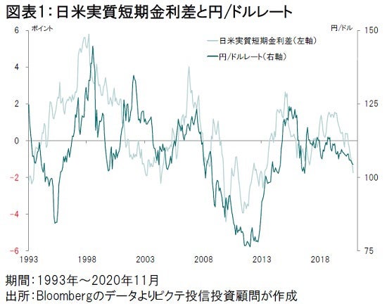 しかしながら、為替相場に大きな影響力を持つのは、通貨間の名目金利差ではないだろう。理論的に考えれば、物価上昇率を加味した実質金利差であるはずだ。過去における円/ドルの動きを見ても、概ね日米間の実質金利差に連動してきたと言える(図表1)。