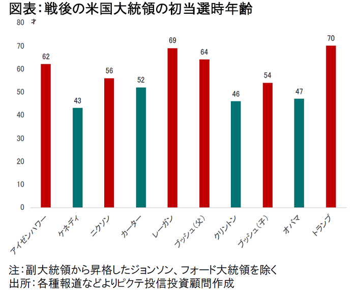 まず年齢だが、図表は戦後の大統領の初当選時の年齢を示している。赤の共和党の場合、最も若かったのはリチャード・ニクソンの56歳、平均年齢は62歳だ。緑の棒で示した民主党は、J・F・ケネディ43歳、ジミー・カーター52歳、ビル・クリントン46歳、バラク・オバマ47歳であり、5人の平均年齢は共和党より15歳若い47歳である。つまり、米国の有権者は、共和党候補に「経験と安定」、そして民主党候補には「若さと変化」を求めているのだろう。