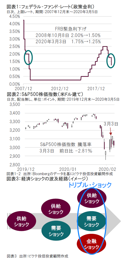経済ショックは主に需要ショック、供給ショック、金融ショックの3つがある。需要ショックは増税等によって消費や設備投資が減少し経済が低迷すること、供給ショックは工場や店舗などの供給能力の毀損によって経済が低迷すること、金融ショックは金融機関の破綻等によって経済が低迷することを指す。今回は新型コロナウイルスの感染拡大によって工場の生産能力低下、供給網や交通網の遮断、小売り店舗の一部閉鎖などが起こったことから、供給ショックと分類できる。そもそも中央銀行による利下げは需要ショックに対処する金融政策なので(FRBが緊急利下げを行ったところで感染拡大を抑制(供給能力を回復)できるわけではない)、マーケットが売りで反応しても不思議では無いのだ。