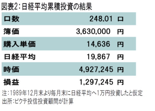 日経平均が38,915円の最高値を記録した1989年12月末から、毎月末に1万円ずつ日経平均を買い続けたと仮定した場合、今年2月末、購入した日経平均の口数は248口、単価は14,636円になった(図表2)。この30年間は日本株にとり非常に厳しい時代だったが、足下の急落後もまだ益が出る計算だ。時間分散の効果と言えるだろう。