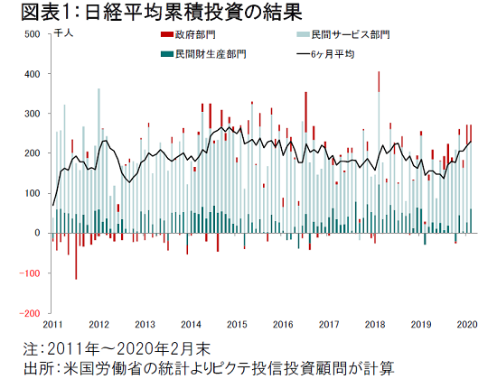 新型コロナウイルス、米国大統領選挙に市場の関心が集中しており、経済のファンダメンタルズへは注意が向き難くなる。そうしたなか、3月6日に発表された2月の米国雇用統計では、非農業雇用者数は27万3千人増加した。市場予想の17万5千人増を大幅に上回り、直近6ヶ月平均は景気の好不調の目安と言われる20万人増を超える23万1千人増だ(図表1)。また、前日に発表された米国供給管理者協会(ISM)による2月の非製造業景況感指数も、前月比1.8ポイント上昇の57.3だった。これは、2018年11月以来の高水準に他ならない。