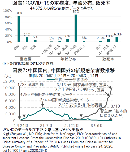 米国医師会雑誌(The Journal of the American MedicalAssociation ) に2 月24 日に掲載された「中国におけるCOVID-19アクトブレイクの特徴と重要な教訓(中国CDCによる72,314症例の報告と概要)」によると:①COVID-19は、わずか30日間で1つの都市から全国に急拡大をした、②確定症例の81%が軽症だが年齢分布をみると、高齢者、例えば80歳以上の致死率は14.8%と高水準(図表1参照)、③「新規感染者」(陽性反応により感染が確定した症状発症者)が増え始めた段階では「症状発症者」(症状は発症したが、検査をしていないため「新規感染者」として認識されていない患者、遡及調査に基づく) は急速に増加していた(1月23日時点で「症状発症者」は約2500人)、④武漢を1月23日封鎖した直後の1月25日に「症状発症者」はピークをつけるが「新規感染者」は増え続け、2月4日にピークをつけて終息に向った、と分析されている(図表2参照)。また、3月10日に習主席は武漢市を初訪問し、湖北省での感染について「基本的に抑え込んだ」と宣言した。