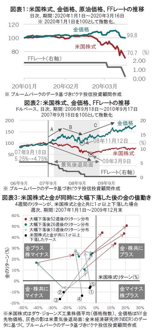同様の動きは、リーマンショック前後のときにも見られた(図表2参照)。景気後退局面に入る前に利下げが開始され、当初金は上昇するも(A)、米国株式が下落を続ける中で下落に転じた(B)。ただ、いち早く底をつけ、株よりも先に上昇に転じ、大きなリターンを提供した(C)。