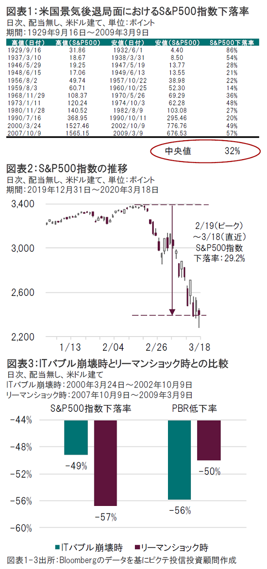 景気後退を伴う株価の下落局面ではPBR(株価純資産倍率)が参考にされることがある。PER(株価収益率)は1株あたり利益の変動が大きくあまり当てにならないため、(比較的変動が少ない)純資産と株価を比較したPBRが投資指標として用いられる。しかし、日本株のように株価が解散価値を下回る(=PBR1倍割れ)ような割安感が意識される状態とは異なり、米国株のPBRは3月18日時点で2.6倍と割安感は無い。また、S&P500指数のPBRはITバブル崩壊時で5.2倍(2000年3月24日)から2.3倍(2002年10月9日)へ低下、リーマンショック時で3.0倍(2007年10月9日)から1.5倍(2009年3月9日)へ低下しており、「一定の水準を下回れば買い」といった法則もない。あえて法則を見出すとすれば、ピークから底までのPBRの低下率だろう。ITバブル崩壊時は56%の低下(2.3÷5.2-1)、リーマンショック時は50%の低下(1.5÷3.0-1)だった。どちらの暴落局面もPBRの低下率は50%台だ。この2つの平均値(53%)を今回のケースに当てはめると、S&P500指数がピークをつけた2月19日の同指数は3,386.15なので、3,386.15×(1-0.53)=約1,600ポイントが下値の目処になる。金融ショックが起こった場合のリスク・シナリオとして、頭の片隅に入れておきたい。