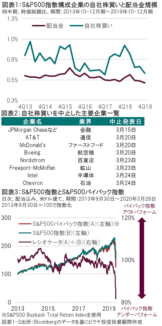 米国企業(S&P500指数構成企業)は資本配分政策において概して自社株買いに積極的であり、2013年10-12月期以降の自社株買い規模(四半期ベース)はS&P500指数の時価総額に対して平均3.01%(年率換算)と、配当金の同2.16%を上回る規模となっている(図表1)。自社株買いは、発行済み株数の減少を通じてEPS (1株当たり利益)を押し上げる効果や、流通株式の減少による株式需給の改善、自社の株式が割安だと市場に発信するアナウンスメント効果などがある。特にコロナショックのように株価が急落した局面では、積極的な自社株買いが期待されるところだが、今回ばかりは様相が異なる。