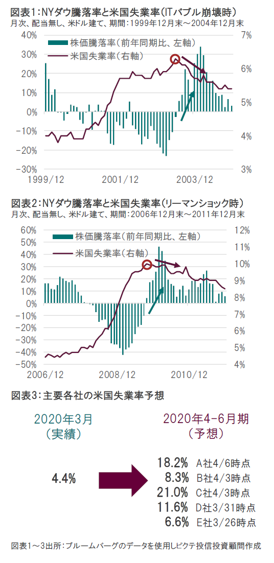 ITバブル崩壊時とリーマンショック時におけるNYダウの株価騰落率(前年同期比)と米国失業率を比較したグラフをご覧頂きたい(図表1、2)。ITバブル崩壊時は米国の失業率が2003年6月の6.3%のピークをつけた翌月にNYダウは前年同期比でプラスに転じた。また、リーマンショック時は米国の失業率が2009年10月の10.0%のピークをつけた同じ月にNYダウは前年同期比でプラスに転じた。一般的に失業率は景気の遅行指数と言われるが、景気後退局面では株価の底入れを示すシグナルになりうる。それでは失業率がピークを打つのはいつだろうか?主要金融機関の米国失業率予想を図表3に示した。2020年3月の実績値が4.4%であるのに対し、2020年4‐6月期の予想値は6.6%~21.0%とかなり範囲が広いものの、ここからさらに失業率は悪化するという見方がコンセンサスになっている。今のところ7-9月期以降は経済活動の再開とともに失業率が低下していくとの見方が支配的となっているが、経済活動の再開が延期または再開したとしても回復が鈍いということになれば、失業率がさらに悪化するリスクをはらんでいる。いずれにせよ、NYダウのV字回復は一筋縄ではいかないだろう。