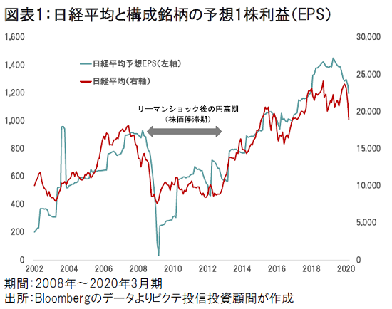 日経平均は、構成銘柄の予想1株利益(EPS)に連動する傾向がある(図表1)。リーマンショックの際、日本株は5年間に渡る底ばいを続けたが、ファンダメンタルズから見ると、それは業績低迷が直接的な要因だったのではないか。