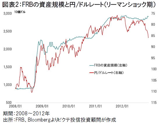 リーマンショックの後、為替はドル安・円高になった。FRBが量的緩和(QE)を実施、国際金融市場においてドルの供給過剰感が強まったことが主な要因だ(図表2)。