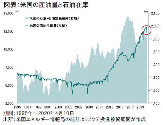 WTI原油先物は、期日において差金決済ではなく、現物決済される。一時的に価格がマイナスになったのは、期日を控えて在庫が積み上がり、貯蔵コストの高騰が反映されたものだ。それはテクニカルなものとしても、石油価格の下落は、1)新型ウイルスによる需要減、2)市場の寡占化を目指すサウジ・ロシアが仕掛けた価格戦争、3)国際的な脱化石燃料化の動き、4)シェール革命による米国の産出量大幅増‥の4点が背景と見られる。特に、米国の増産は、世界の石油市況に構造的な影響を与えているのではないか。